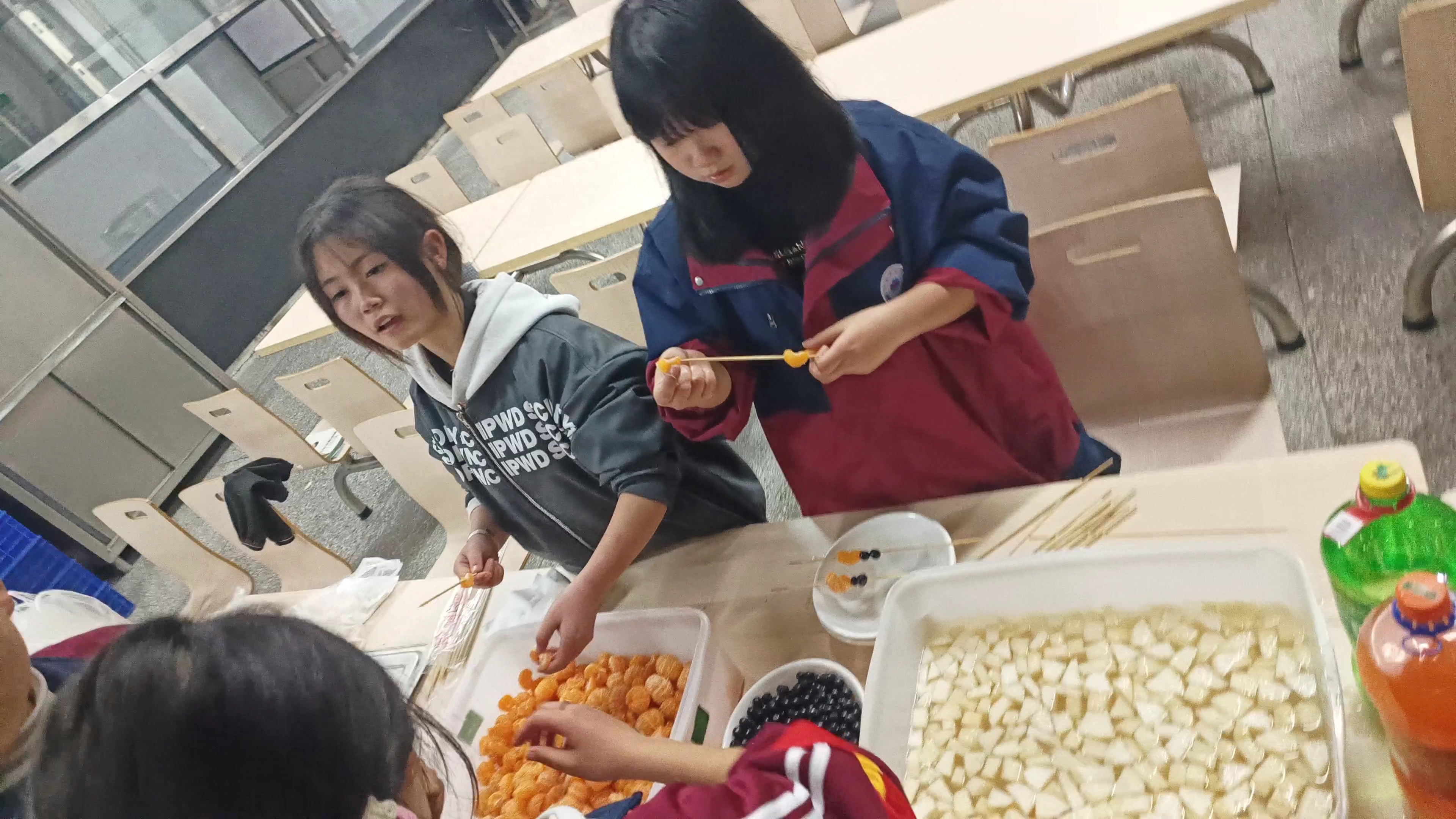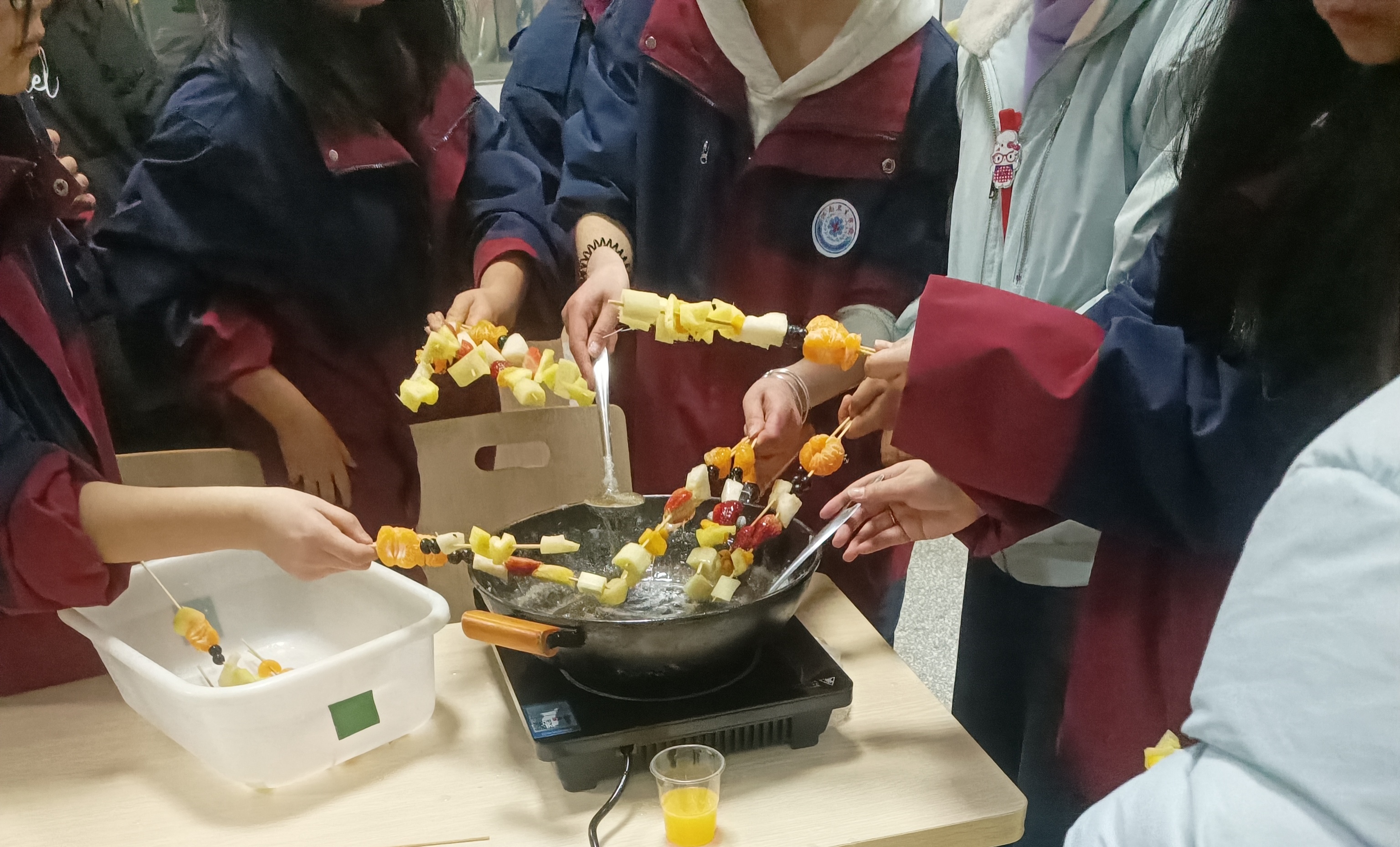 活动现场,食堂变身“甜蜜工坊”,鲜红的山楂、金黄的橘子、饱满的圣女果整齐摆放,竹签、糖锅、案板一应俱全。老师们率先示范,手把手教学生挑选新鲜果实、清洗沥干、均匀串签;同学们围在一旁认真学习,有的细心串果,有的帮忙递签,有的主动清洗工具,分工明确、配合默契。从青涩尝试到熟练操作,师生间没有隔阂、没有距离,欢声笑语此起彼伏。大家在动手协作中践行“团结守纪、和谐共进”的校风,每一串糖葫芦都承载着集体的温度,每一次配合都彰显着同心的力量。