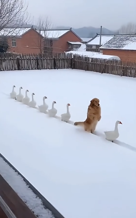 9.混在鸭群中的金毛,真是难为它两个脚走路了。