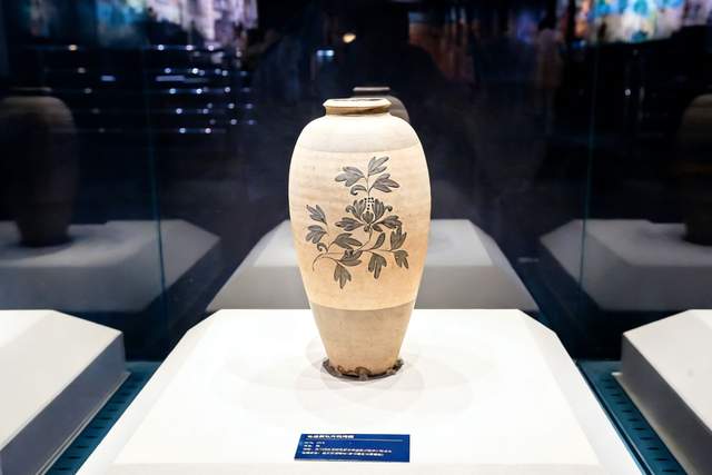出土于宋代磁州窑的白底黑牡丹纹梅瓶瓶身线条流畅,黑彩绘制出盛放的牡丹,造型饱满、釉色温润,优雅又不张扬。