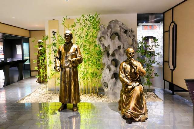 清代遵义的文人风貌通过青铜雕塑呈现在人们面前,背景的太湖石、翠竹营造出雅致的文化氛围,搭配书法作品,可见清时遵义文化的兴盛。