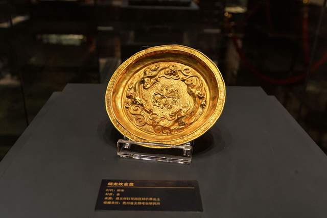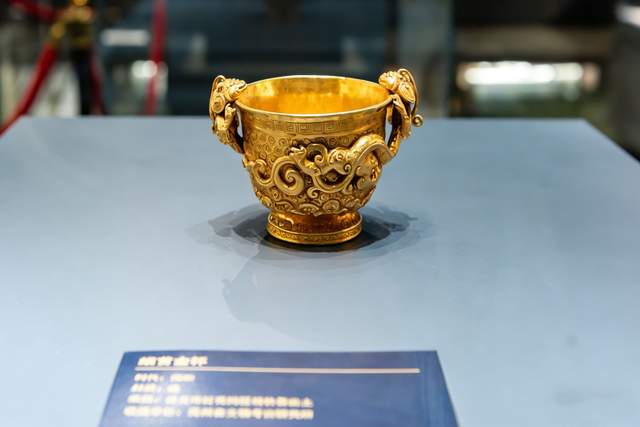 南宋螭首金杯出土于播州土司杨价墓,纯金打造,杯身雕刻着灵动的螭龙纹,两侧螭首造型栩栩如生,杯身在灯光映衬下金光熠熠,奢华大气,当时播州贵族审美在线,手工匠人的技艺也同样让人赞叹。