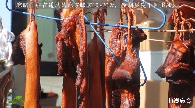 6、晾晒:腌制好的五花肉穿上绳子,挂在通风的地方晾晒10~20天,根据天气等实际情况注意观察,晾晒到肉表面微微出油,干硬度到自己满意的程度即可,