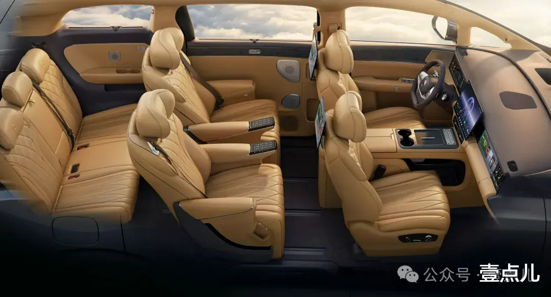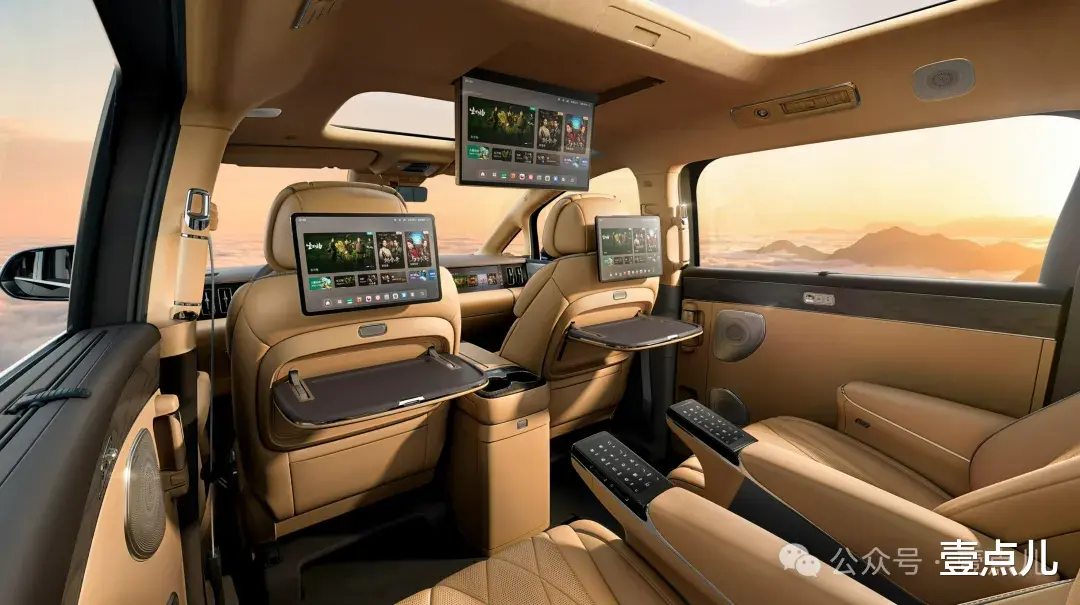 座舱正真诠释了冰箱彩电大沙发。前排15.6英寸中控屏、副驾10.25英寸、后排15.6英寸吸顶屏+两个后排头枕娱乐屏,一共5块屏幕!