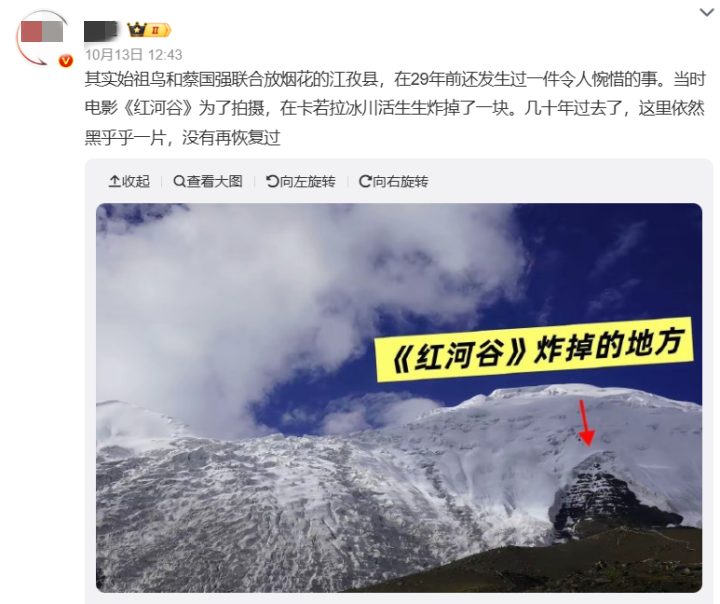 1996年,电影《红河谷》为了拍一个几秒钟的“雪崩”镜头,直接用炸药在冰川上炸出了一个大口子。那是西藏三大大陆型冰川之一啊!