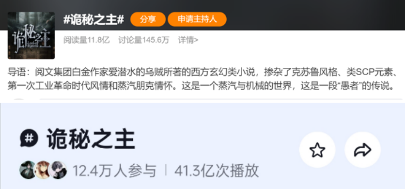 图:微博上#诡秘之主#话题阅读量高达11.8亿,抖音#诡秘之主#话题达41.3亿次播放