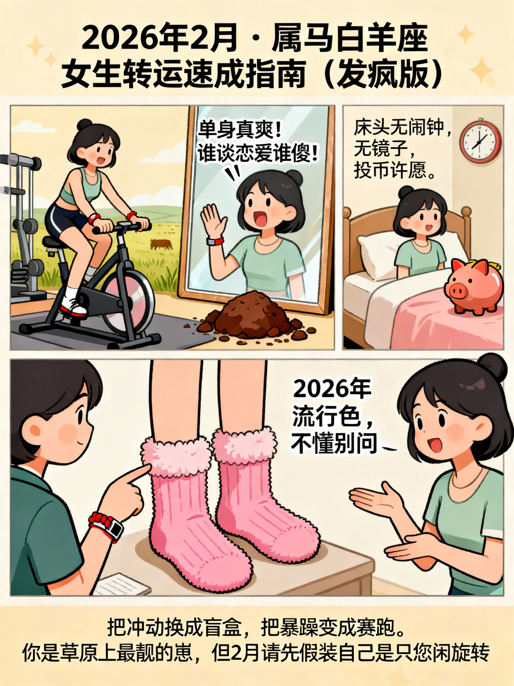 6. 终极玄学:穿粉色袜子解释:属马需“蹄下生辉”,白羊需“软化气场”。一双毛绒粉袜,兼顾风水与卖萌,专防出门踩坑。若被同事嘲笑,请回答:“2026年流行色,不懂别问。”