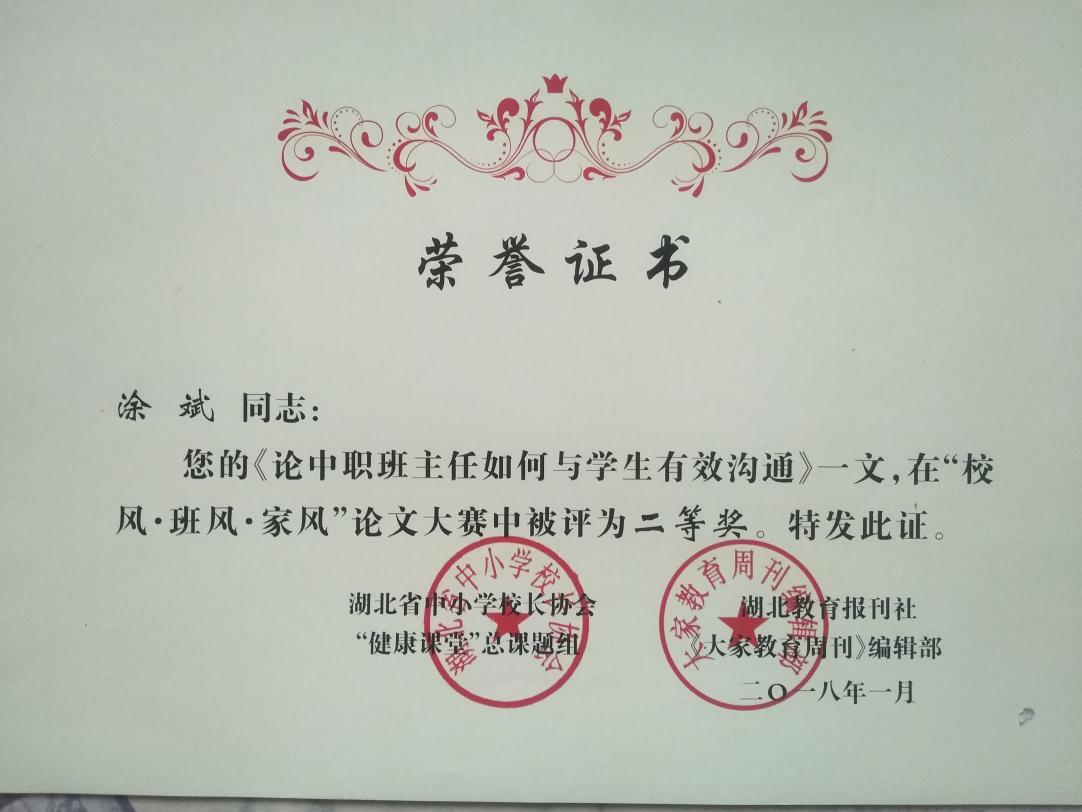 2015年12月获武汉市中职生职场写作比赛一等奖指导奖。