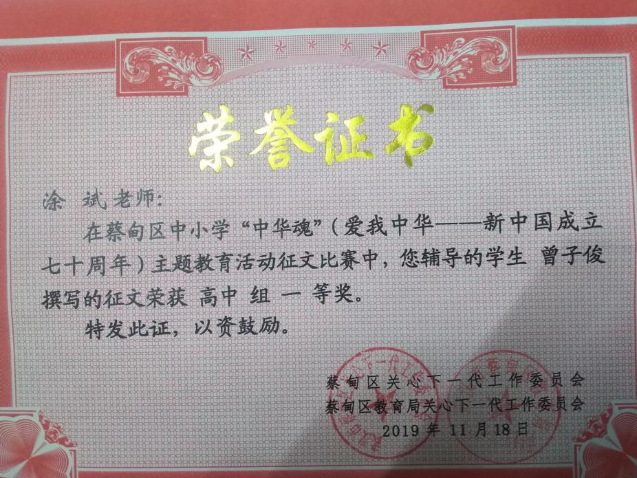 2019年11月区关工委、区教育局关工委、区中小学“中华魂”(爱我中华—新中国成立七十周年)主题征文比赛,辅导(学生曾子俊)征文荣获高中组一等奖