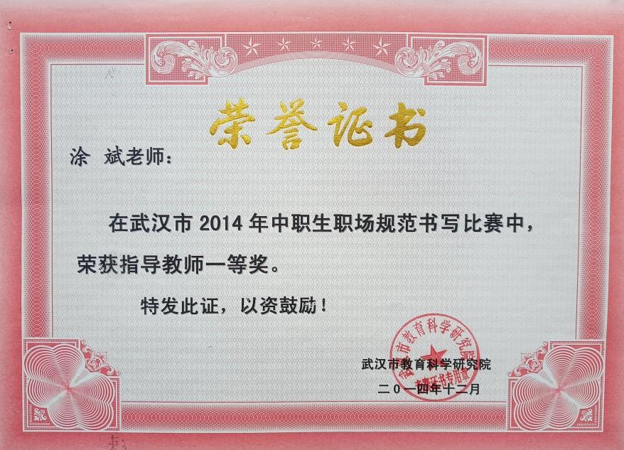 2014年12月武汉市2014年中职生职场规范书写比赛指导教师一等奖