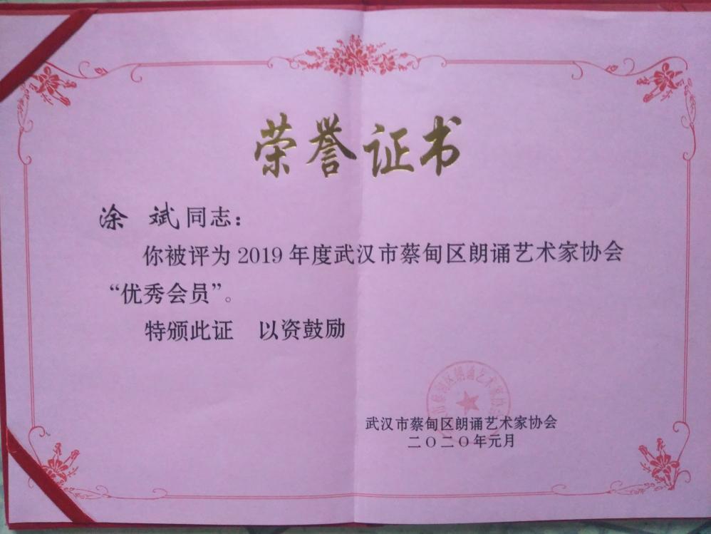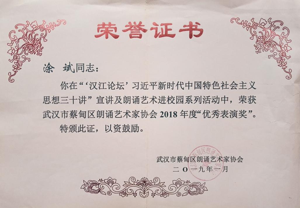 2019年1月区朗诵艺术家协会“‘汉江论坛’习近平新时代中国特色社会主义思想三十讲”宣讲及朗诵艺术进校园系列活动,区朗诵艺术家协会2018年度“优秀表演奖”
