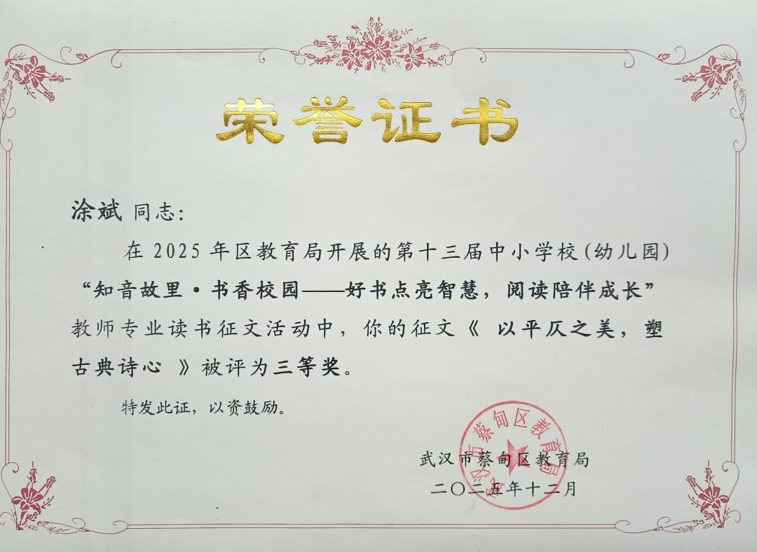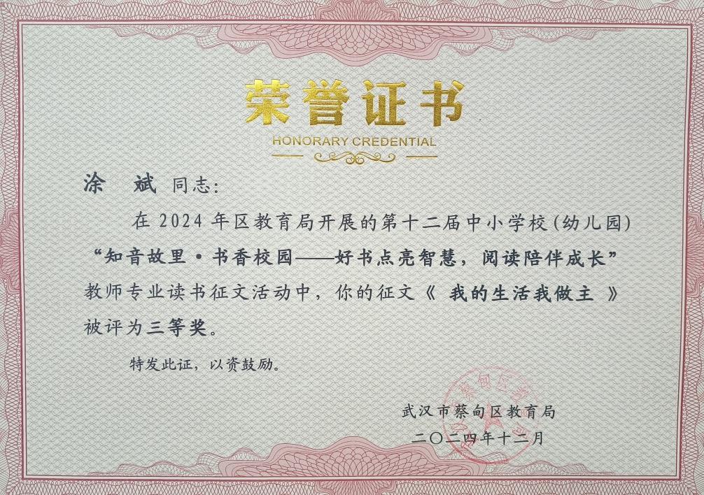 涂斌勤思考,善总结,积极撰写关于阅读、创作和教育方面的论文,在省、市、区各级各类征文中获奖。