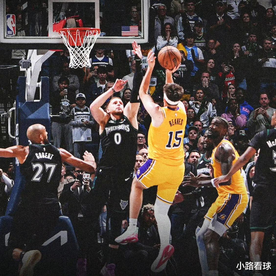 从比赛过程来说,可以算是跌宕起伏,荡气回肠,湖人一度领先两位数,却在最后十秒被森林狼反超一分,最终又靠着里夫斯的高难度抛投绝杀涉险过关,拿下一场关键又宝贵的胜利。没有错,这场比赛里夫斯再次爆发,在没有詹姆斯和东契奇的情况下,里夫斯手握大量球权,最近几场比赛是一步步完成进化,前两场分别砍下51分和41分,彻底证明了自己的得分能力,也逼得对手开始疯狂包夹他,因此这场比赛里夫斯又展现出自己作为持球大核的另一项能力,优秀的组织串联,全场出战40分钟,24投9中,,得到28分1篮板16助攻2抢断。
