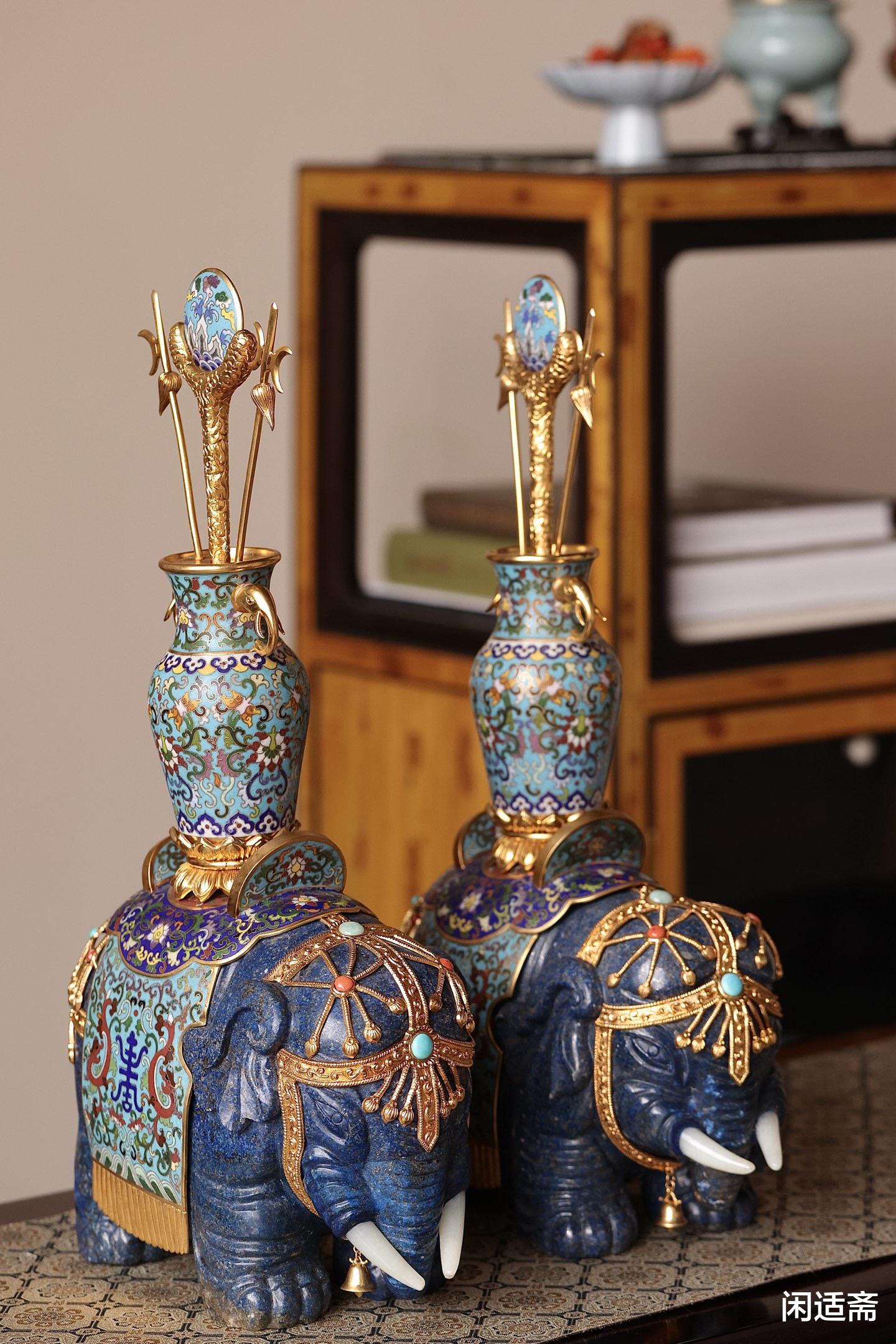 在传统宫廷陈设中,“太平有象” 的材质多为金、玉或纯珐琅,而这件作品以青金石与景泰蓝混搭的形式呈现,更显稀有珍贵 —— 青金石的 “石中帝王” 之气,与景泰蓝 “燕京八绝” 的富丽之美相得益彰,既保留了宫廷器物 “不惜工本” 的雍容格调,又在材质组合上突破传统,进一步凸显其独特价值。