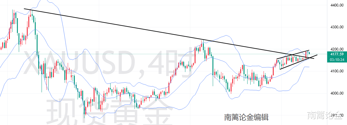 下方呢,先去关注就这一轮上涨,就拉一条小的斐波那契去尝试一下。前方的密集的整理区域呢,这个位置与4小时的布林带中轨形成共振,大概是在4105~55左右。其次呢,就是要更低一点啦,就是那个分水岭节奏嘛,我们之前说过的,随着行情的波动的变化,它是有一点点收窄的,大概是在4110~4120。