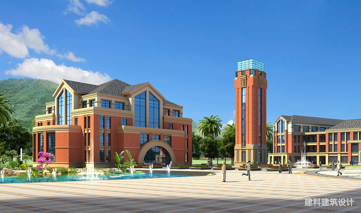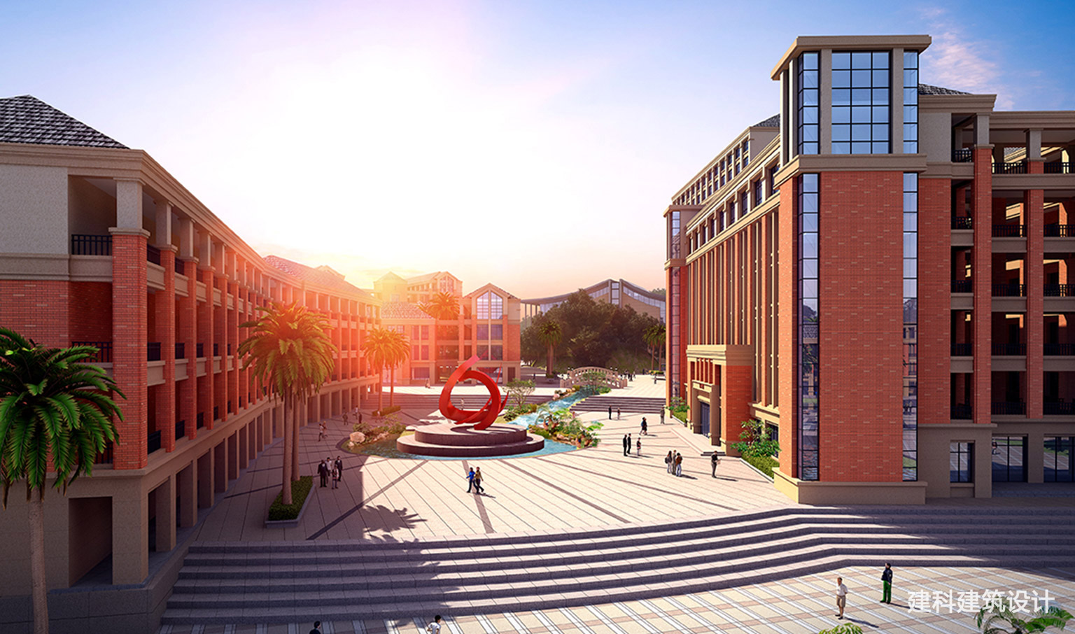 当红砖的厚重撞上玻璃的轻盈,教育城的每一寸空间,都在生长希望。连廊牵起课堂与庭院,雕塑的红焰跃动着青春的脉搏,棕榈的影、喷泉的声,把 “学习” 酿成一场与自然共生的日常。在这里,脚步不必匆忙:台阶是课间的歇脚处,广场是思想的会客厅,建筑不只是容器,更是陪伴成长的“同路人”,让每一次抬头,都能撞见光影里的未来。
