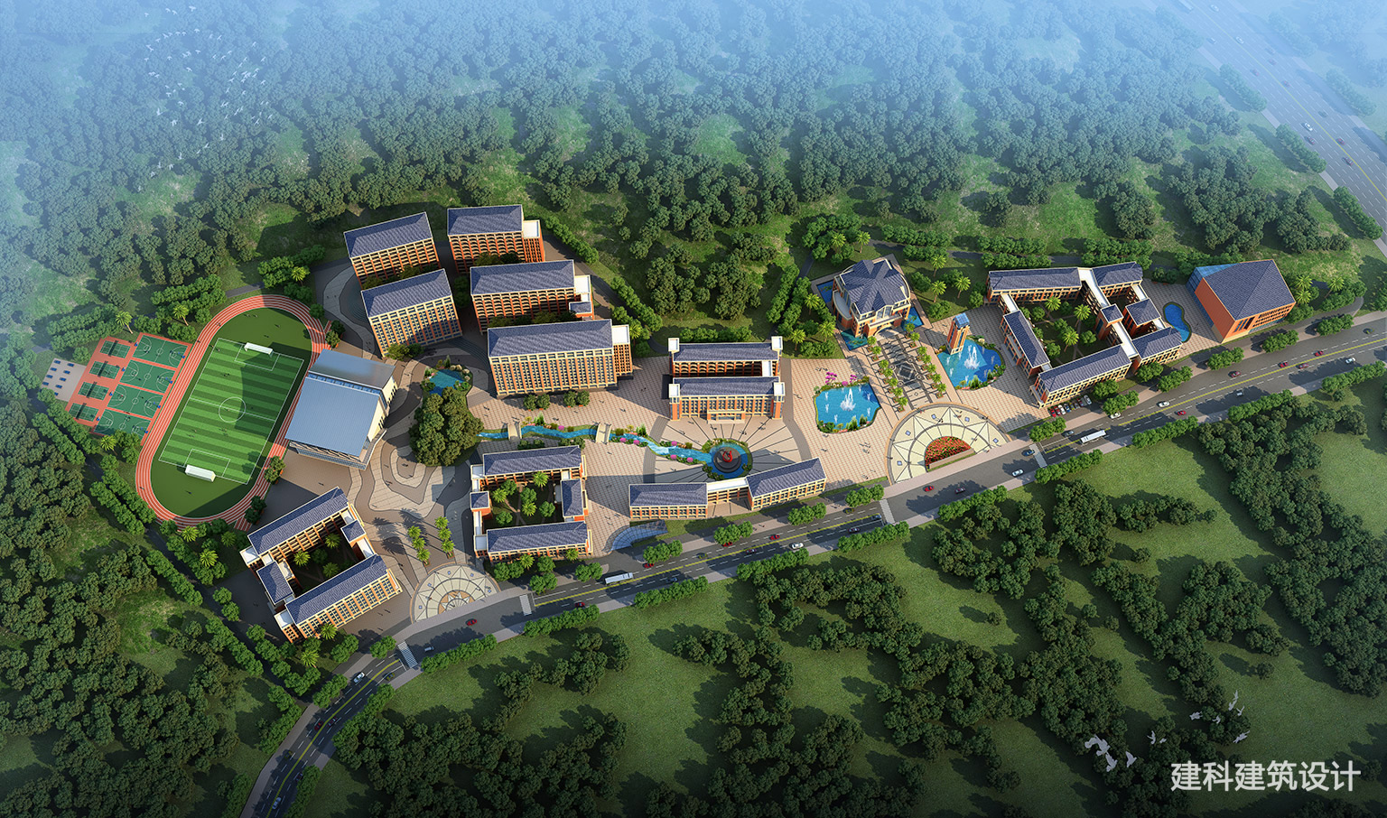 被林海环拥的教育城,把课堂搬进了氧吧:教学楼群错落成“林间书院”,连廊串起庭院与喷泉;运动场是草坪上的活力坐标,跑道裹着鲜氧延伸;中央广场的水景与雕塑,成了课间漫步的治愈角落。在这里,铃声和鸟鸣同频,课本里的“自然”,是推窗可见的绿意。一所长在森林里的校园,让成长不止于教室,更在天地间舒展。