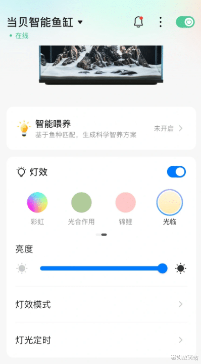 远程控制,控制的不是机器,而是一份安心。 出差三天,也不用拜托朋友上门帮忙喂鱼。国庆长假回老家,也不用担心鱼缸变成一潭死水。灯光可以设置成模拟自然日出日落的模式,定时开关,不仅让鱼生活得更规律,也成了家里一道准时的风景线。