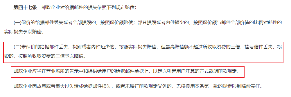 同时,《邮政法》要求邮政企业应当在营业场所的告示中和提供给用户的给据邮件单据上,以足以引起用户注意的方式载明前款规定。