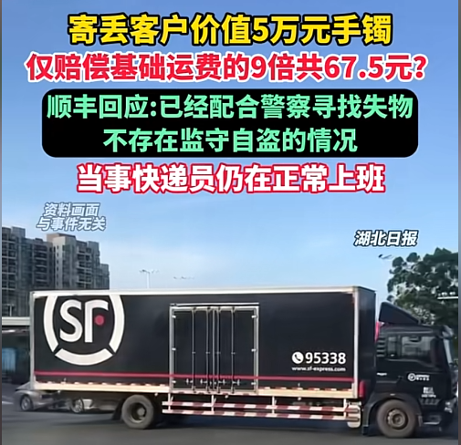 据媒体报道,广东佛山陈小姐网购了一只价值4.98万元的翡翠手镯,但收到货后不太满意,于是选择退货退款,5月22日10点由指定的顺丰速运上门取件,23日晚,陈小姐接到快递员电话,称快件丢失了。
