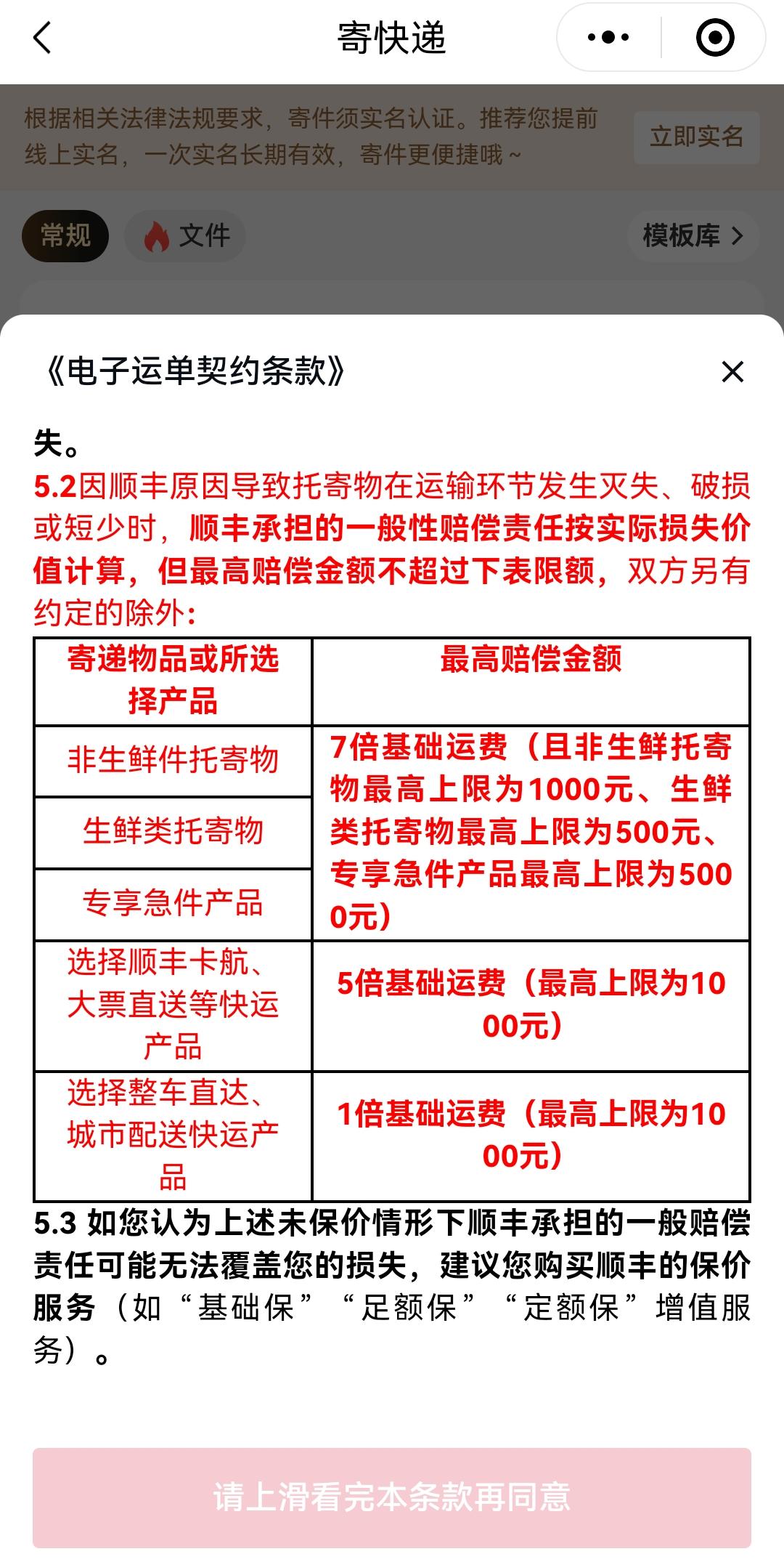 值得关注的是,如今都通过快递小程序下单,用户往往需要勾选同意相关条款方可完成下单操作,否则无法下单,而这些涉及赔偿责任的关键条款,通常以较小的字号设置在下单页面底部。不难发现,消费者在寄件时往往处于被动接受条款的弱势地位,当纠纷发生时,企业常以“用户已同意条款”作为抗辩理由,用户因此陷入维权困境。