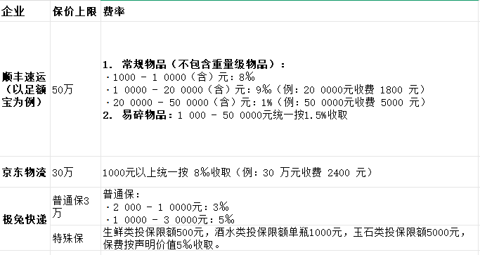 此外,服务范围存在明显的“天花板”。顺丰、京东保价上限分别为50万、30万,极兔则更低,对于珠宝、艺术品、高端电子设备等价值更高的物品来说,快递行业普遍缺乏标准化的保价方案,企业之间保价服务差异明显。为了安全,或许可以通过购买单独保险,但流程繁琐,成本增加。