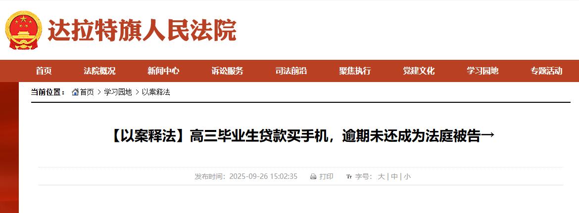 一个更令人心痛的案例发生在刚刚成年的孩子身上,据达拉特旗人民法院发布的案例,一名高三毕业生,为了购买一部新手机,在未告知父母的情况下办理了分期贷款。他原以为靠打工可以偿还,但收入不稳定导致逾期。最终,贷款公司将其告上法庭。