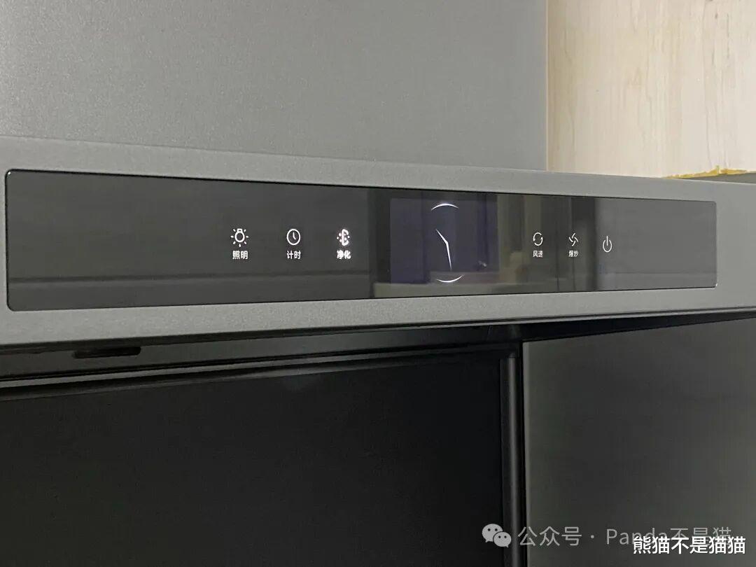 净烟机的显示面板为一块3.1吋的全彩液晶屏幕,屏幕会显示时间、PM2.5、CO、GAS、WiFi、风速等重要信息,同时当PM2.5超过100μg/m³也会进行高亮提示。左右两侧则是照明、计时、风速调节、开关等触控开关,内部还内置了手势传感器。