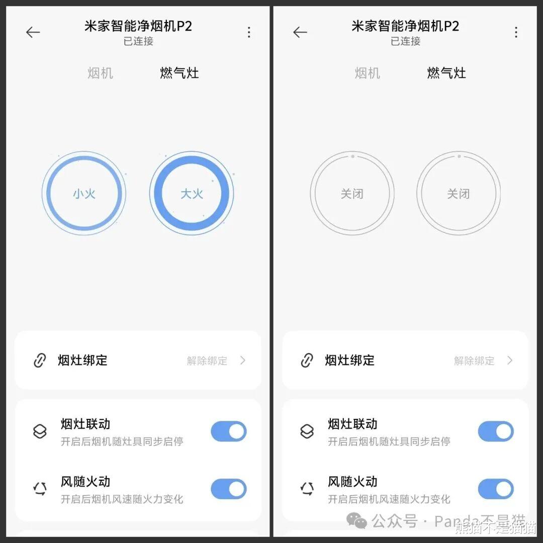 除此之外,米家净烟机P2和灶台也是有联动的。通过配对之后可以实现开启燃气灶,烟机便会自动启动亮灯,并根据火力大小自动调节吸风档位,自动吸排油烟。