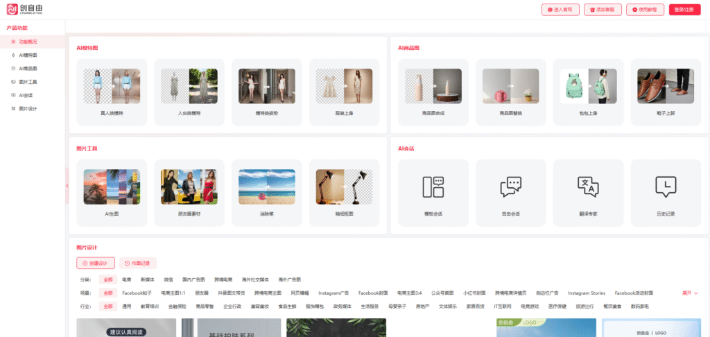 一站式创意设计平台,有很多现成的模板,可以生成商品图,包括全景图、近景图等。