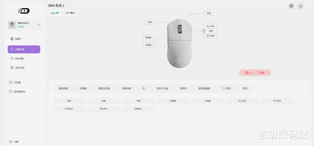 这个网页驱动真的要重点夸一下。SKN的自研网页驱动不需要下载安装任何软件,直接搜就能打开。鼠标连上电脑后自动识别,驱动功能丰富且实用,可在按键功能页自定义全按键功能,适配多样操作习惯;在 DPI 设置页灵活调节多档 DPI 与回报率,兼顾精准度与流畅度;在高级功能页设置滚轮方向、左键锁定等系统功能,满足个性化使用需求;还能在宏设置页录制自定义宏命令,一键触发复杂操作,全方位提升游戏与办公体验。