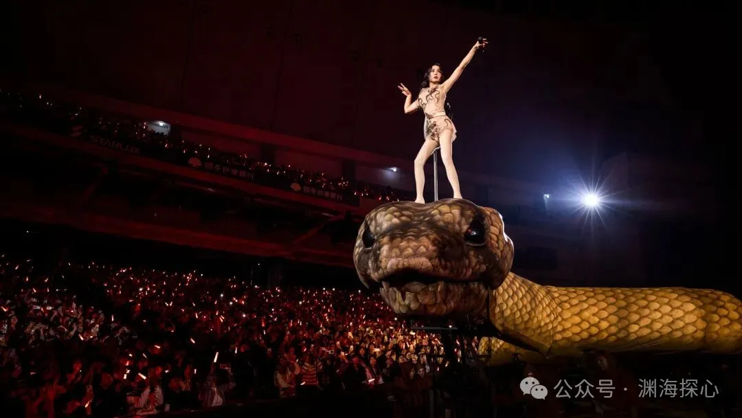 一条巨大的、逼真的蛇在舞台上摇晃而过,