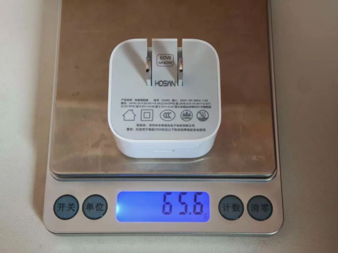 它官宣是60W功率,带3C认证标志,实测重量是65.6克。铭牌印着三种输出功率,分别是ASV 20V/2A[3A DPS]、15V/2.67A[3A DPS],其中DPS是Dynamic Power Supply的缩写,意指动态电源。