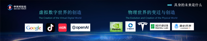 屏幕上,左边是“虚拟数字世界的创造”,右边是“物理世界的变迁与创造”。