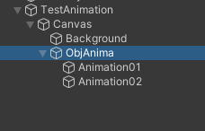 2. 添加需要组件Background 添加 Image 组件;ObjAnima 添加 Rect Mask 2D 组件和 Animation 组件;Animation01 和 Animation02 添加 Image 组件。