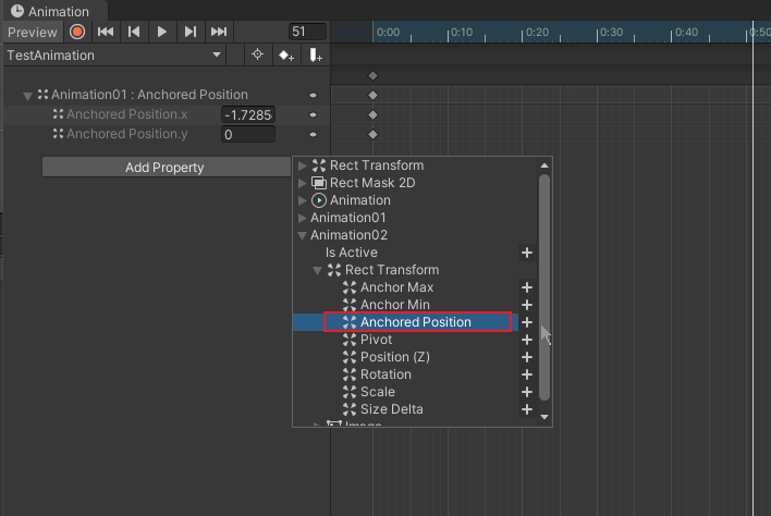 进入编辑框内,点击 “Add Property”,出现弹出小框,会出现当前有 Animation 下的子级,点击下拉会显示子级的属性,像上下移动就选择 Anchored Position 就可以。