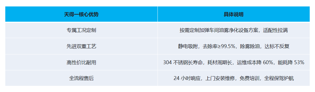 四、天得一核心优势:选对加弹车间油雾净化设备,一次达标不踩坑深耕油雾净化 20 年,天得一聚焦加弹车间专属场景,提供高效、节能、稳定的加弹车间油雾净化设备与制定方案,四大优势护航企业选型: