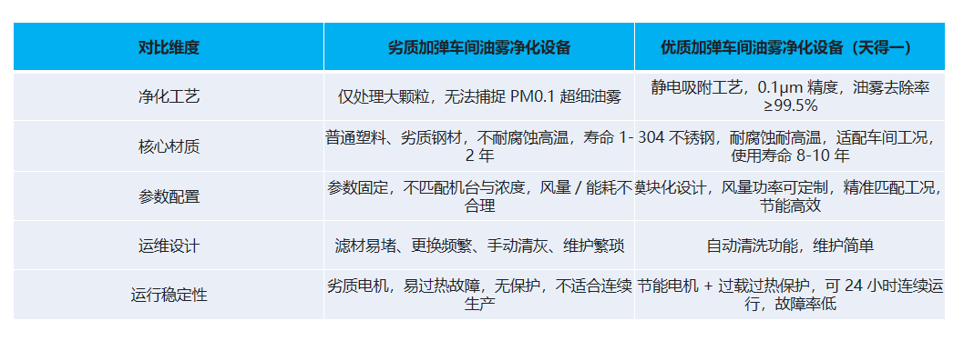 二、核心解析:为什么加弹车间油雾净化设备效果参差不齐?加弹车间油雾净化设备效果差异,根源在净化工艺、核心材质、参数配置三大维度。小厂家为压缩成本,使用落后工艺与劣质材料,且不做工况制定,直接导致效果拉胯。下表清晰对比优劣产品差距,帮你快速避坑: