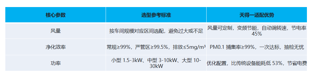 第三步:匹配核心参数,避免浪费与不足风量、净化效率、功率为核心参数,需按工况精准匹配: