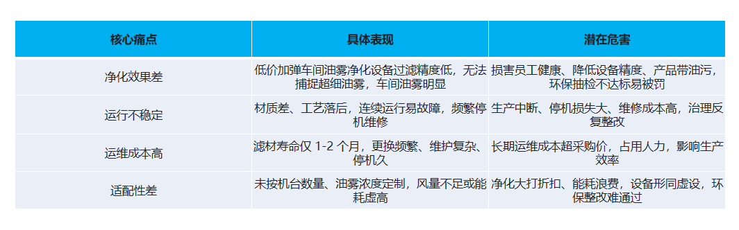 一、痛点直击:加弹车间油雾净化设备效果参差不齐,企业踩坑频发加弹车间工况特殊,油雾浓度高、成分复杂,且多为连续生产,对加弹车间油雾净化设备的净化效率、运行稳定性、运维便捷性要求极高。很多企业缺乏专业选型经验,盲目选购低价劣质产品,导致设备效果不达标,既浪费成本,又耽误生产、影响环保合规。结合行业调研与客户反馈,四类核心痛点最为突出: