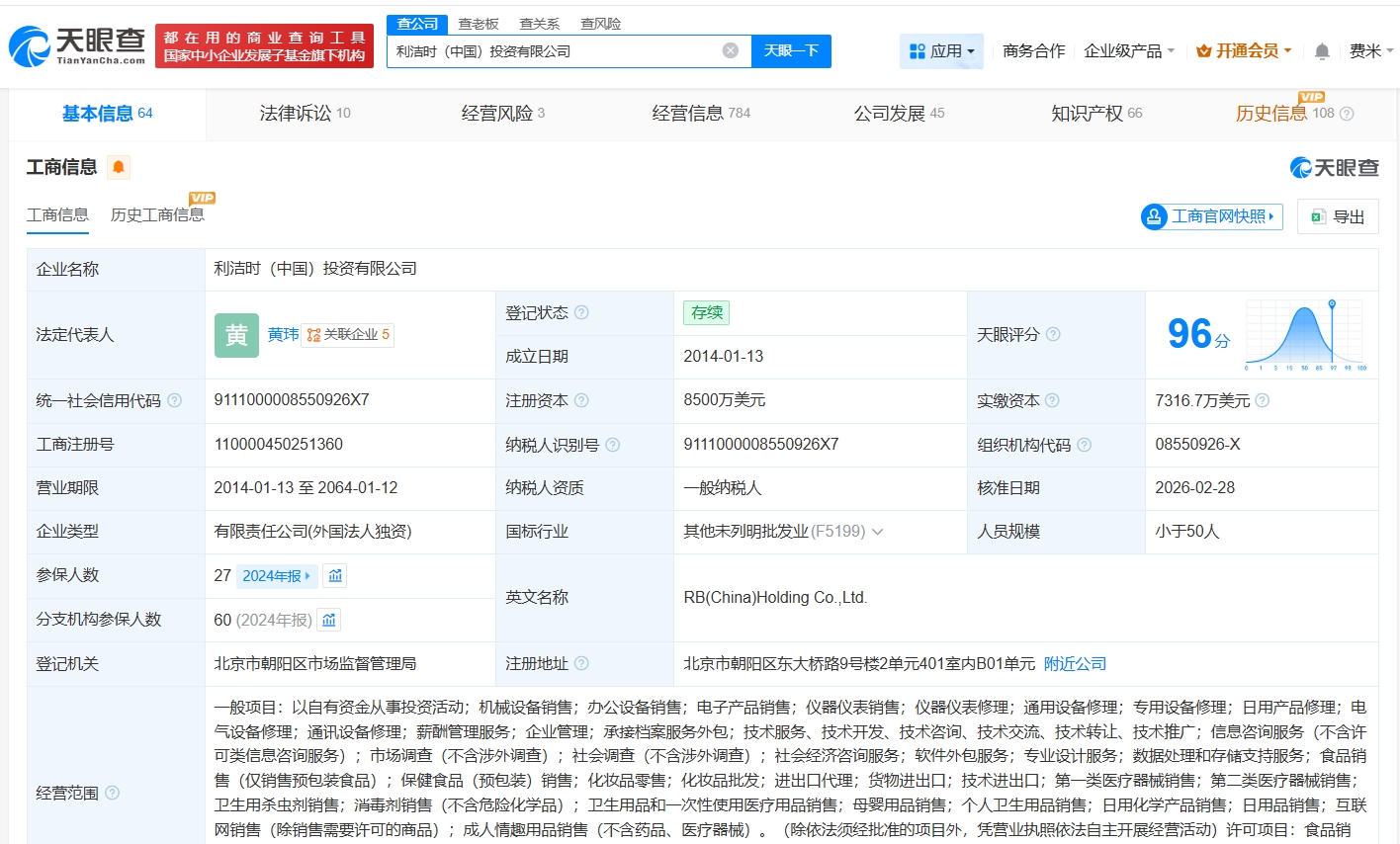 天眼查App显示,滴露关联公司利洁时(中国)投资有限公司成立于2014年1月,法定代表人为黄玮,注册资本8500万美元,经营范围包括以自有资金从事投资活动、机械设备销售、办公设备销售等,由利洁时有限公司全资持股。法律诉讼信息显示,该公司曾涉及合同纠纷、虚假宣传纠纷等案件。