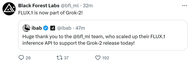此外,xAI 还与初创公司 Black Forest Labs 展开合作,试验他们的 FLUX.1 模型,以扩展 Grok 在 X 上的功能。
