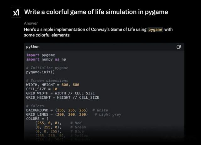 当然,xAI 提供了一些新功能,比如 Conway《生命游戏》的简单实现。