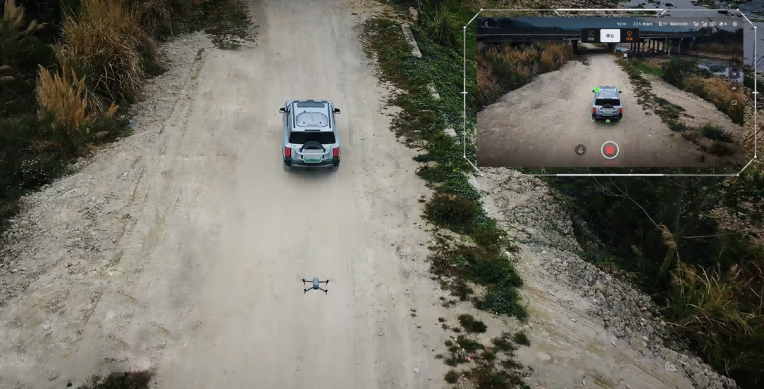 融合了车载无人机定位模块、4K高清车顶摄像头、定制双模式手柄等多个硬件,涵盖了多项专为车载场景定制的新功能:动态起降、随动跟拍、收纳快充、地空双摄、用户可以一键进行多视角拍摄还有“一键成片”和“剪同款”功能。