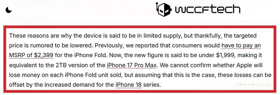 参考iPhone 17 Pro Max目前在国内的定价,iPhone Fold的国行价格很可能落在17999元左右。早前曾有传言称其定价约为2399美元,但最新供应链信息显示,苹果可能将价格调整至1999美元。有分析认为,这一售价对于苹果而言利润空间有限,甚至可能“卖一台亏一台”,因此初期备货数量或许不会太多。而相关亏损,或将通过后续iPhone 18系列的定价进行平衡。