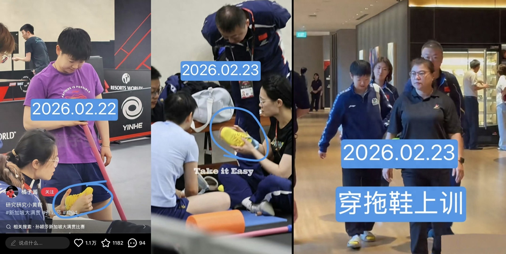 WTT新加坡大满贯赛事正在进行,球迷最近关注的一个点就是孙颖莎的定制球鞋出现了磨脚的情况。国乒的教练保障团队对此很重视,不管是队医还是体能教练都围绕着孙颖莎的定制鞋在商讨策。女队主教练马琳也加入了孙颖莎定制鞋的商讨当中去,而且球迷还拍到孙颖莎穿拖鞋上训的照片和视频。
