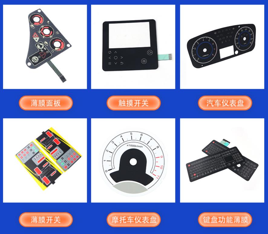 层次基材功能描述丝印内容面板装饰层0.125~0.25mm PC/PET透明膜承载图文符号,提供人机交互界面彩色图文油墨、保护光油上电路层0.075~0.125mm PET导电膜印有上触点导线,按下后与下触点接通导电银浆(主线路)+ 碳浆(触点保护)夹层绝缘层0.05~0.1mm带PET基材双面胶上下电路绝缘隔离,预留按键孔位冲压成型,无丝印下电路层0.075~0.125mm PET导电膜印有下触点导线,构成回路另一极导电银浆(主线路)+ 绝缘油墨(跨线绝缘)背胶层0.05~0.15mm双面胶/3M胶将整体开关固定于安装面无丝印,模切成型核心工艺要点:薄膜按键电路通常需要完成3~5次丝印,标准流程为:银浆印刷→烘干→碳浆印刷→烘干→绝缘油墨(如需)→烘干→面板图文印刷→固化。每一层印刷的精准叠合,决定了开关的电气性能与外观质量。