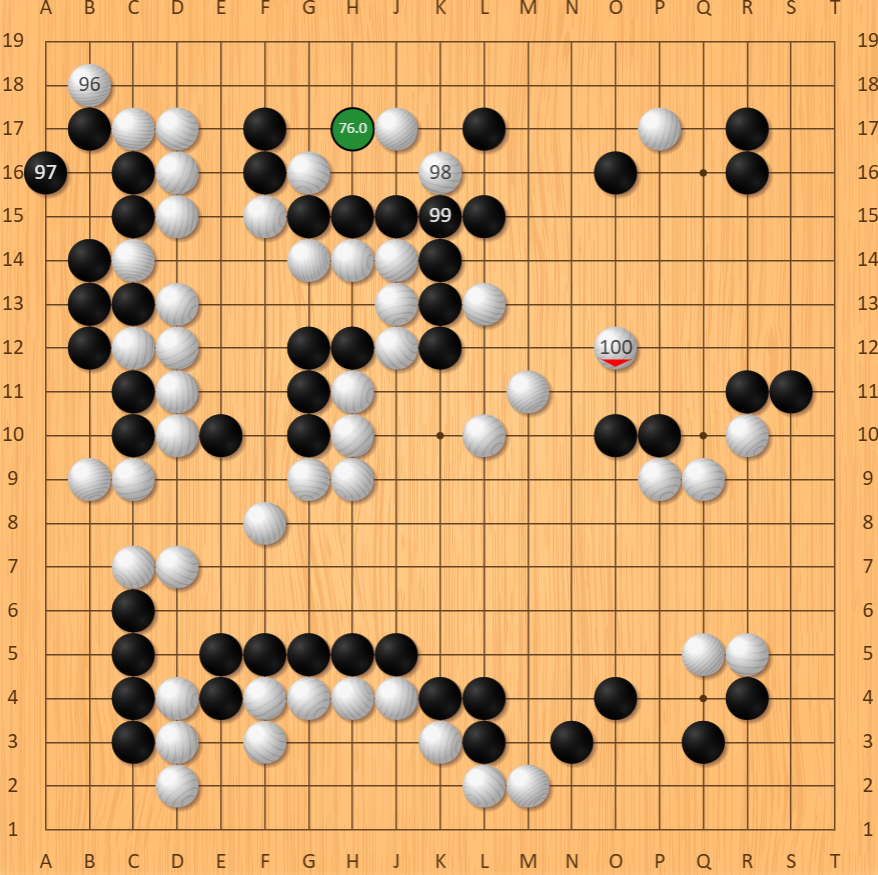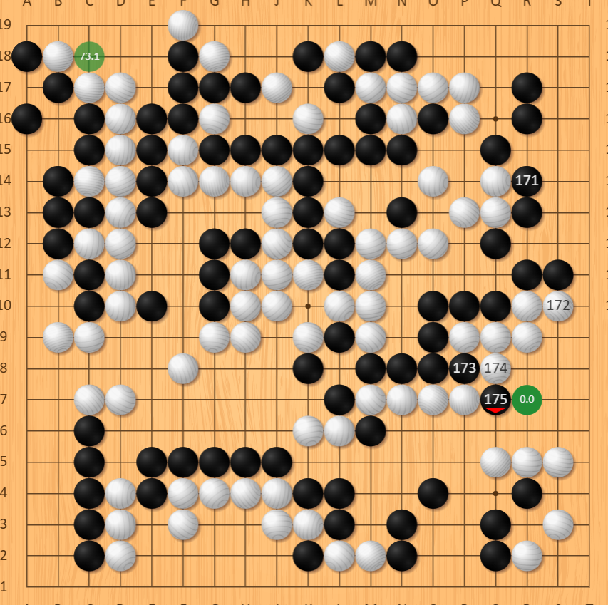 虽然局面有优势,但是胜负点依旧在中腹未布局的空势中,两位棋手也随即在中腹展开了生死大战。172手,白棋的败笔,黑棋随即在阻止了白棋做活,从而速速胜出!
