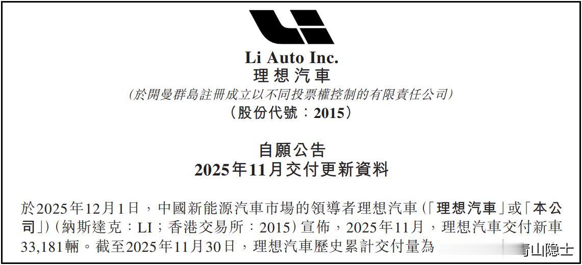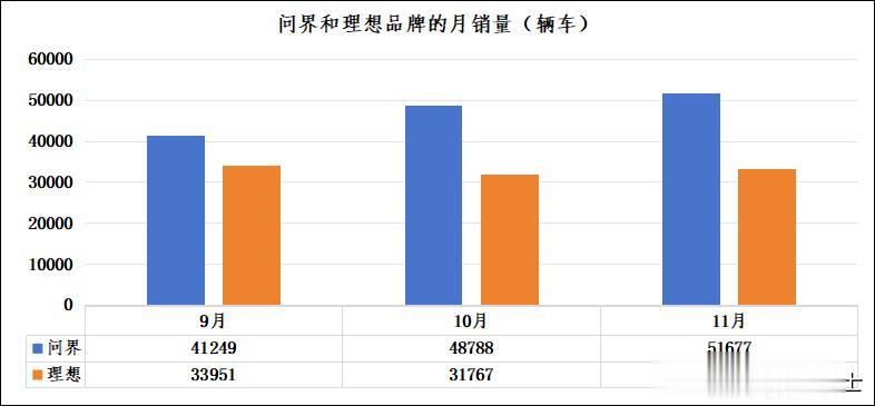 根据理想汽车发布的《2025年11月交付更新资料自愿公告》,其2025年11月新车交付量达33,181辆。对比来看,赛力斯旗下问界品牌同期销量为51,677辆,约为理想汽车的1.56倍,销量规模优势显著。