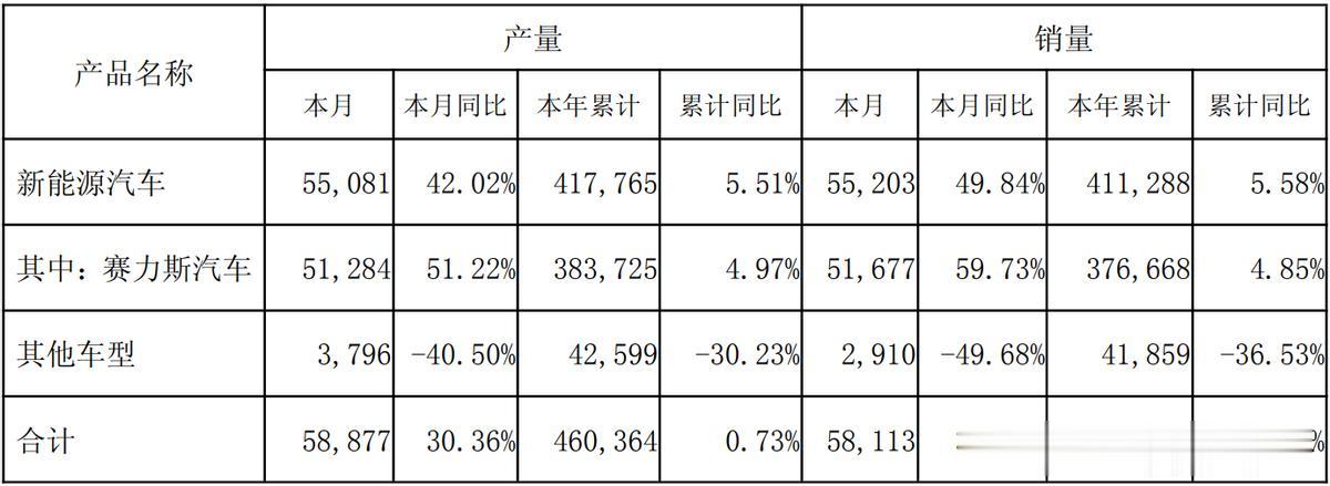 2025年12月初,赛力斯如期发布2025年11月产销快报。核心品牌赛力斯汽车(问界系列)表现亮眼,当月产量51284辆、销量51677辆,同比分别大增51.22%和59.73%;环比来看,较10月产量50619辆、销量48788辆,分别增长1.27%和5.92%,产销环比同比双增,终端需求与增长动能持续凸显。