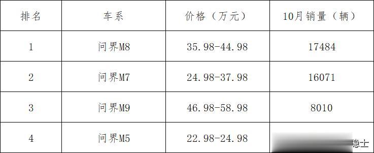 根据汽车之家2025年10月数据,问界品牌以22.98万—58.98万元中高端产品矩阵覆盖市场,其中,M8(35.98万—44.98万元)交付17484辆、M7(24.98万—37.98万元)交付16071辆、M9(46.98万—58.98万元)交付8010辆、M5(22.98万—24.98万元)交付2787辆。以各车型指导价中值为基准,按10月销量加权平均计算,问界品牌平均单车价格约38.44万元。